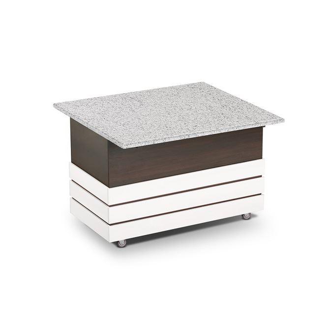 Além disso, o equipamento possui rodízios com trava, facilitando o deslocamento e posicionamento dentro do ambiente, além de permitir a integração com outros módulos aquecidos ou refrigerados da linha de buffet.