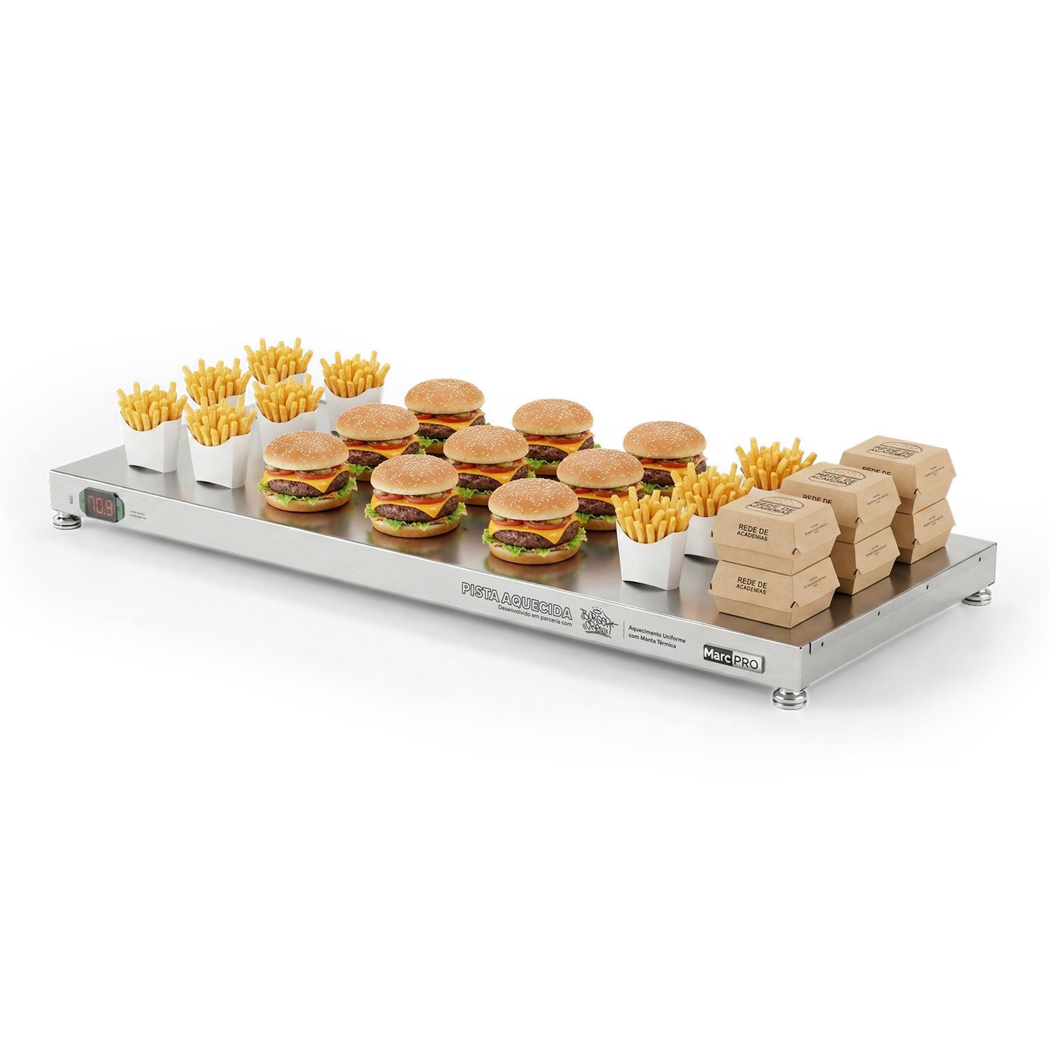 A pista aquecida MarcPRO Marchesoni é um equipamento profissional da linha premium, desenvolvido para manter alimentos aquecidos, organizados e prontos para servir, garantindo qualidade, apresentação e agilidade no atendimento.